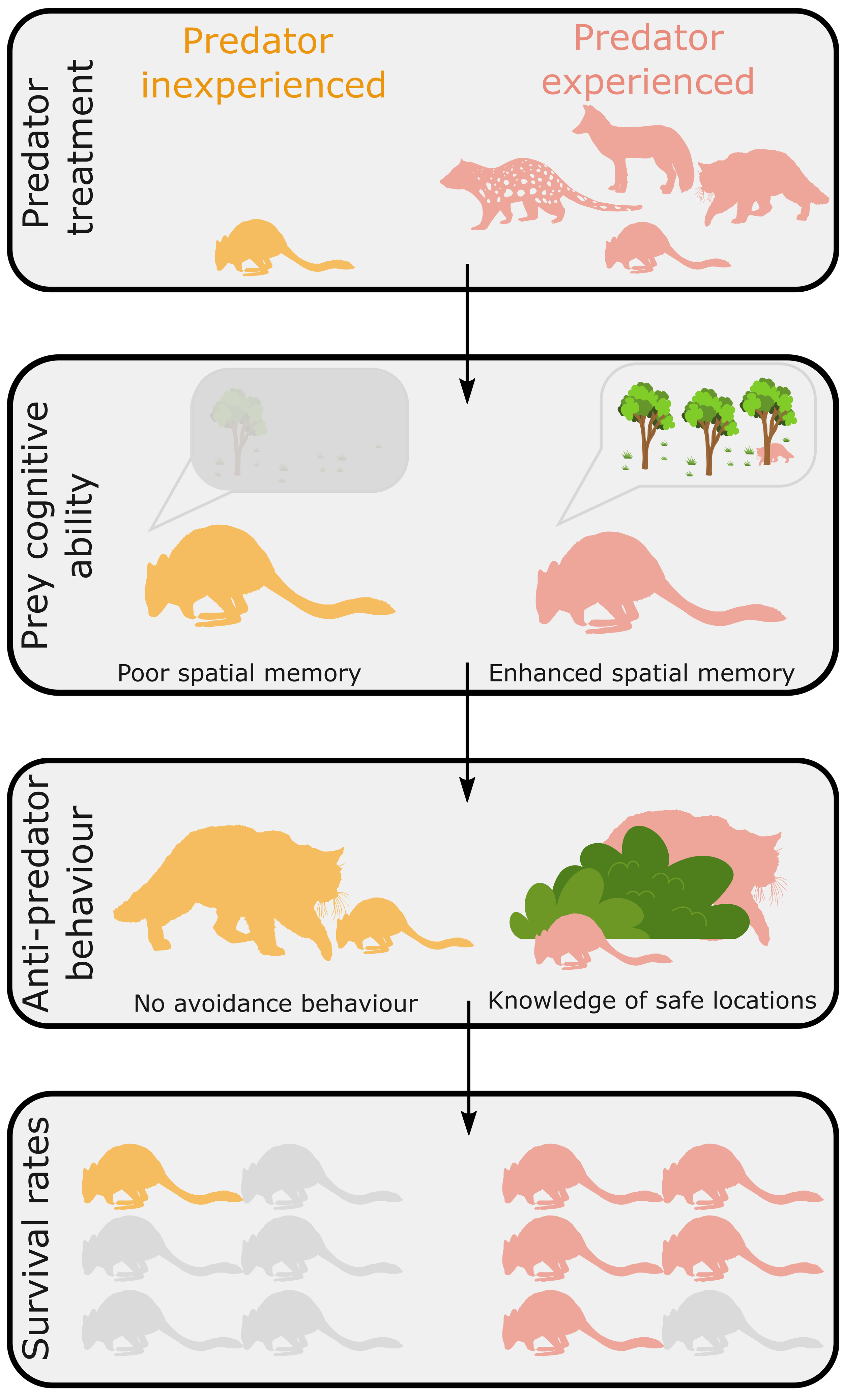 Predation is a driving force of evolution. Prey that fail to avoid predators are removed from populations, while survivors face unavoidable fitness costs that arise from physiological and behavioural responses to predation risk (1). To escape predation, prey learn from experience and memorise landmarks. These are key tenets of cognition (2), the processes by which individual animals acquire, process, store, and act on information from the environment (3). The role of predation in cognitive evolution has been largely overlooked (4,5), in favour of social and environmental explanations (6,7). We are looking for a PhD student who is interested in combining cognitive ecology with community ecology and conservation biology to understand how predation shapes animal learning and memory and then use this knowledge to improve reintroduction outcomes for Australia’s endangered small mammals. The core of this work involves conducting cognitive assays on and quantifying the anti-predator behaviour of Australian small mammals across ecological contexts. The successful applicant will work closely with Dr. Eamonn Wooster on his recently funded ARC DECRA project. More information on the ideas the project tests can be found in Wooster et al., 2024 Trends in Ecology & Evolution (5) and Wooster et al., Nature Reviews Biodiversity, In Press (8).